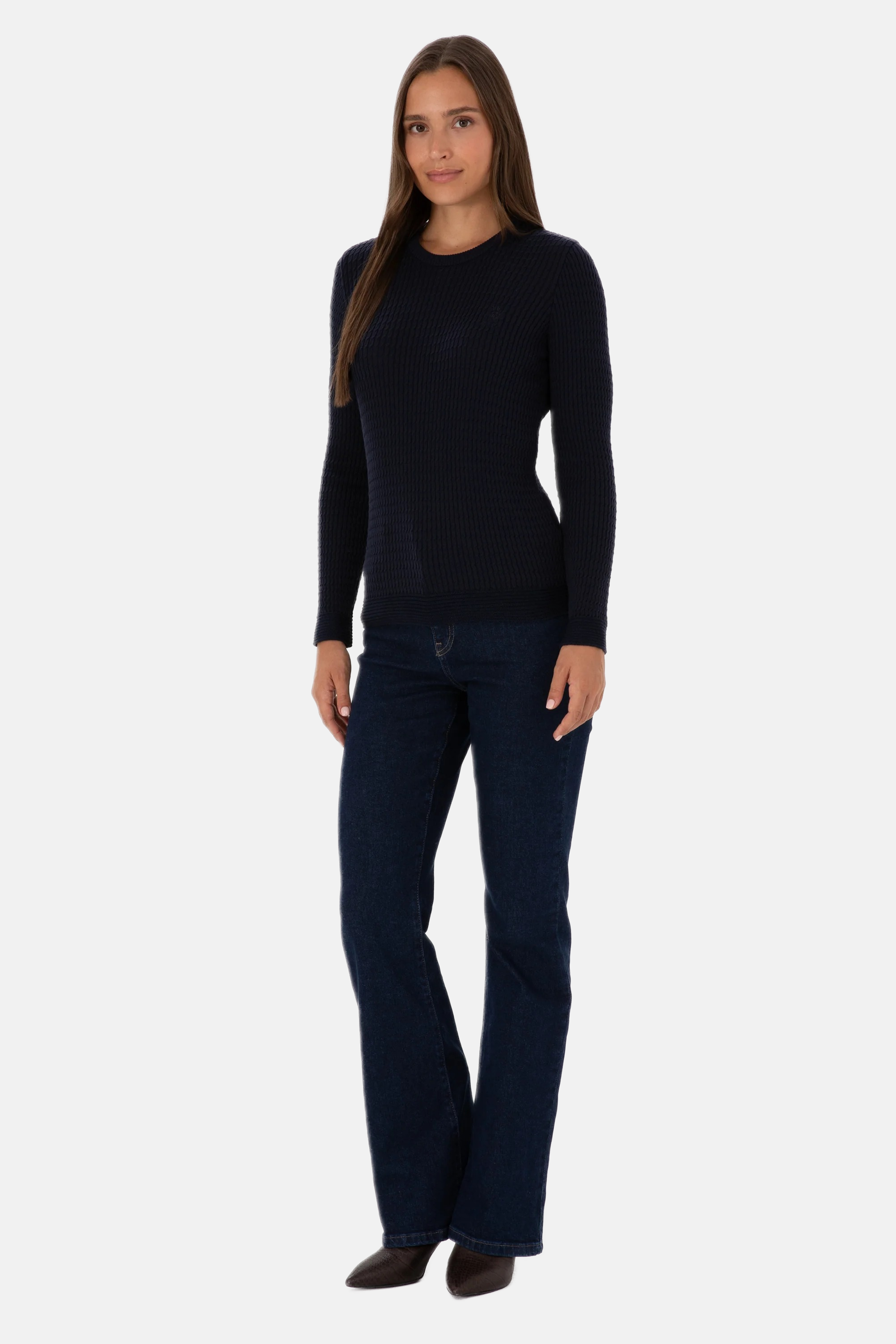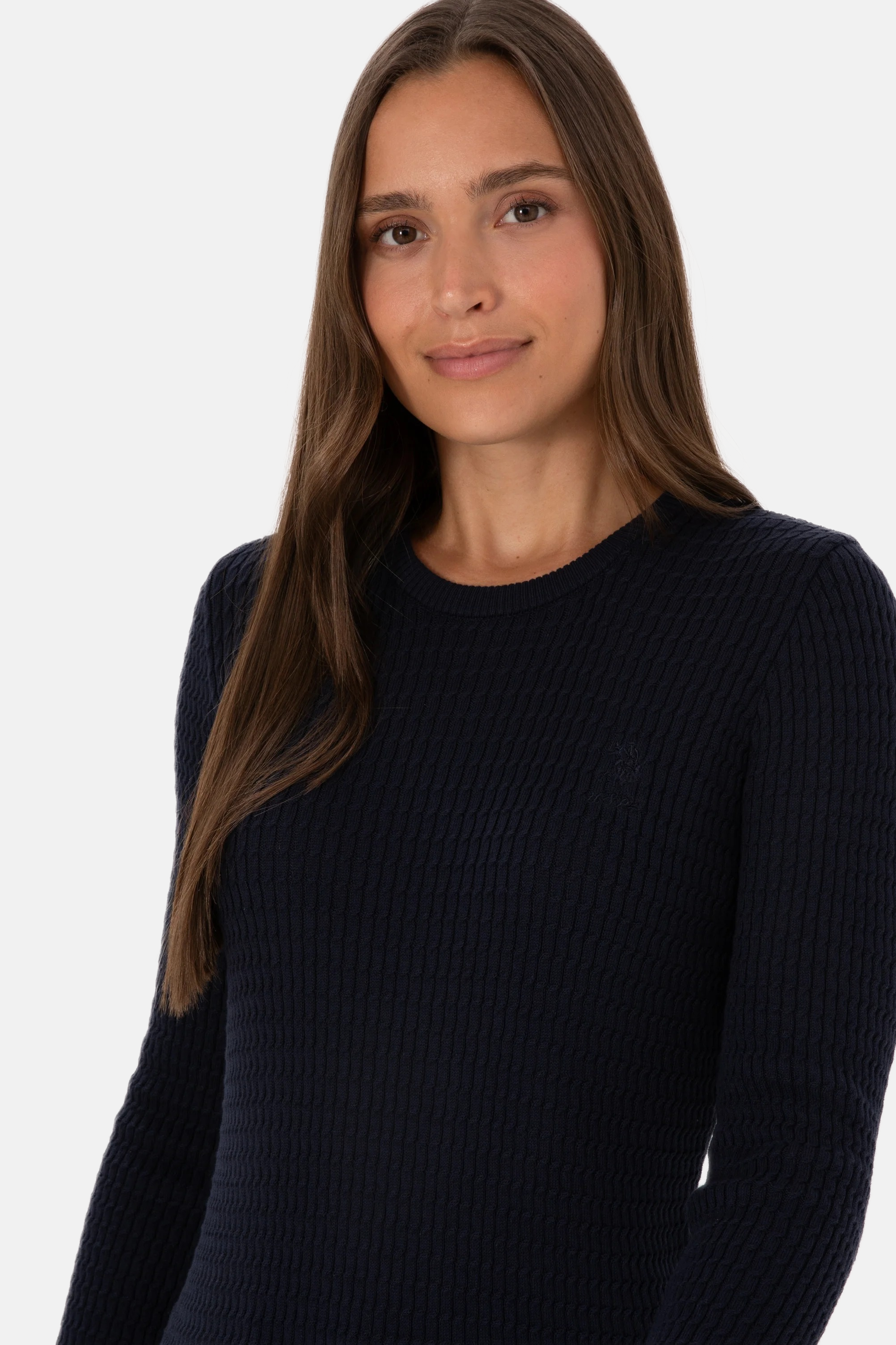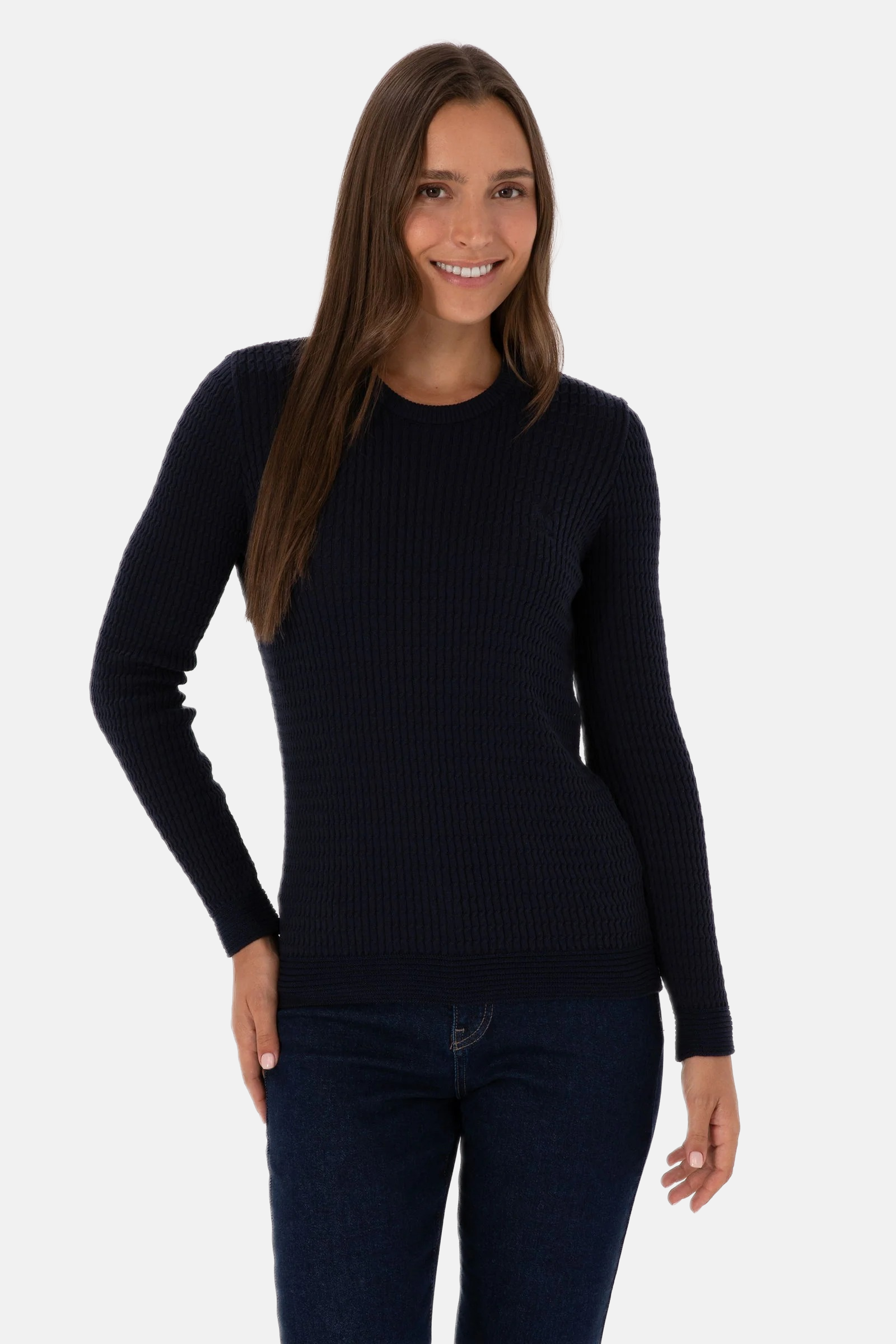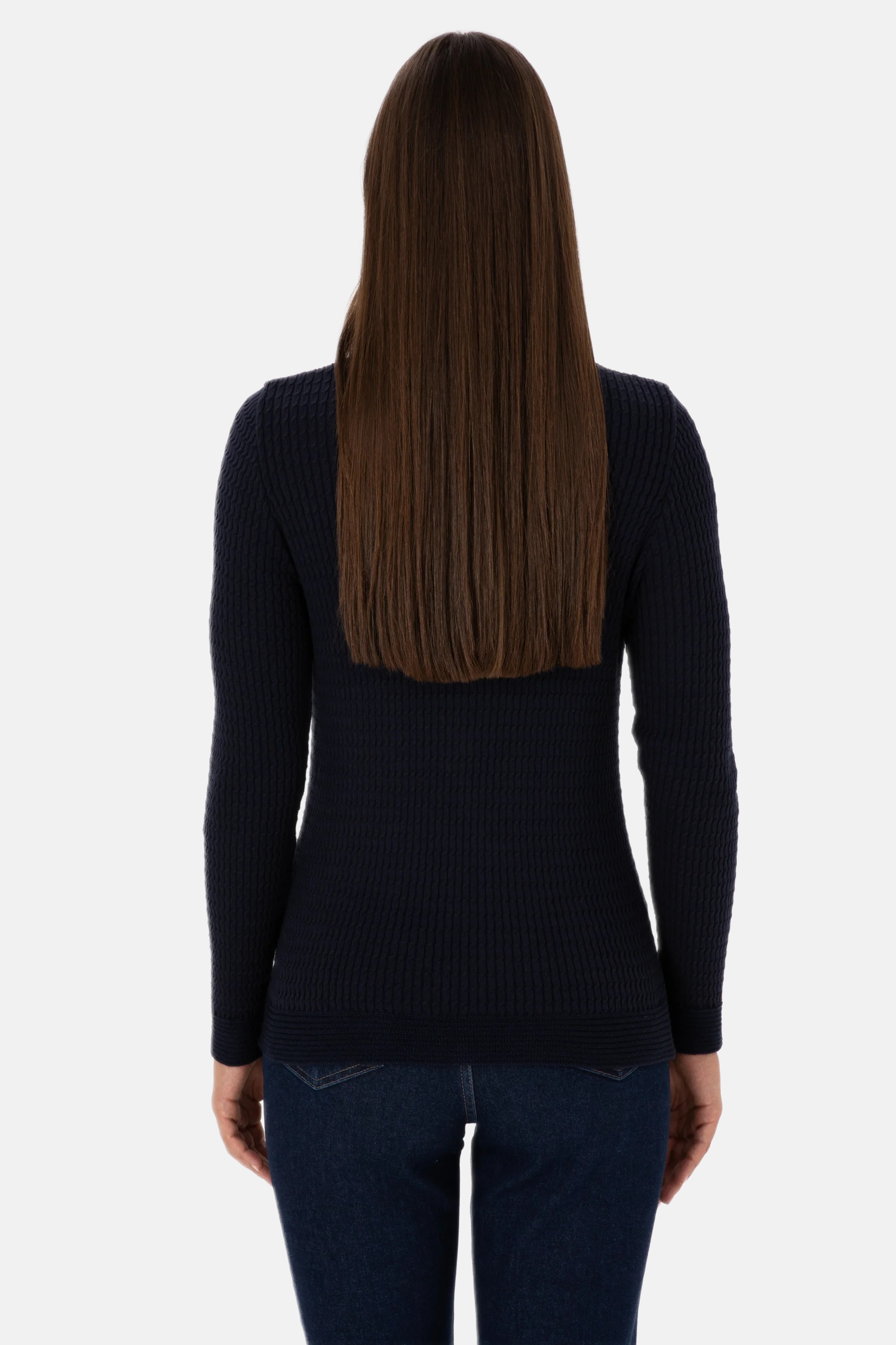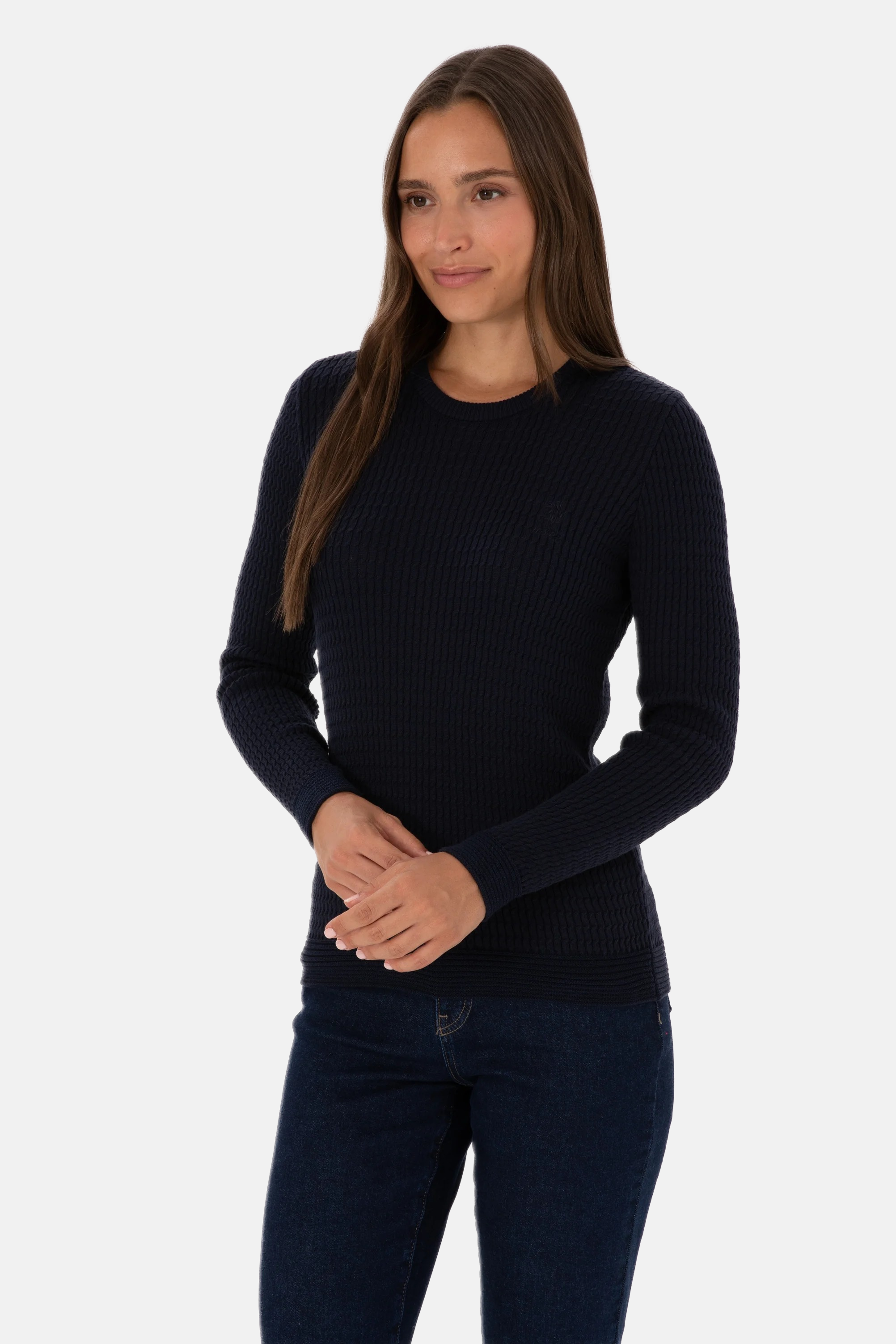 Ovaj šarmantni džemper u tamnoplavoj boji pruža udobnost i stil tokom hladnijih dana. Karakteriše ga mekana rebrasta tekstura koja osigurava prijatno nošenje i odlično pristajanje. Na prednjem dijelu džempera nalazi se suptilan logo koji dodaje modernu notu. Ovaj džemper je savršen izbor za svakodnevne kombinacije, bilo da se radi o ležernom izlasku ili opuštenom druženju s prijateljima, a lako se kombinuje sa različitim stilovima i odjevnim predmetima poput traperica, suknji ili jakni.